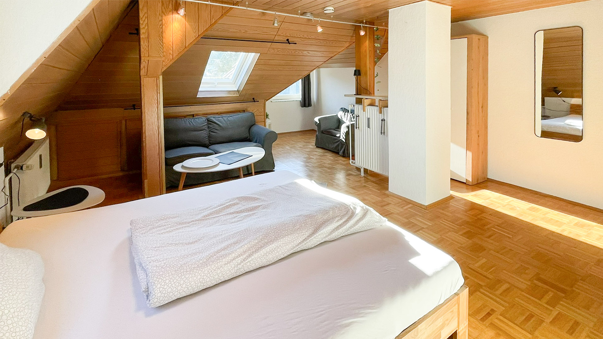Sie erwartet ein separates Einzelzimmer sowie ein komfortables Doppelbett im offenen Wohnbereich. Das modern sanierte Badezimmer sorgt für zusätzlichen Komfort während Ihres Aufenthalts.